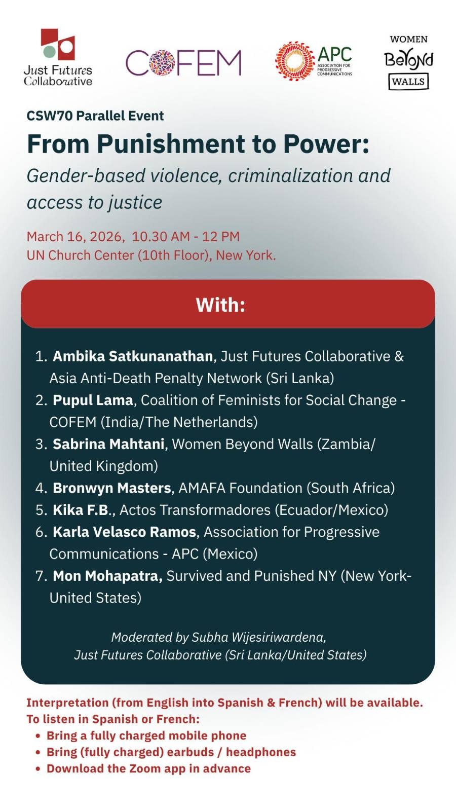 Justice beyond Jails is a global campaign that calls attention to how responses to gender-based violence are too often centered in policing and incarceration. The campaign foregrounds opportunities to advance safety, accountability, and justice that prioritize those who have experienced harm, beyond criminal legal systems. The campaign will run from 18 March to 17 September 2026.