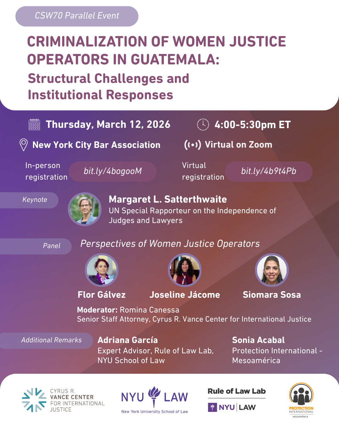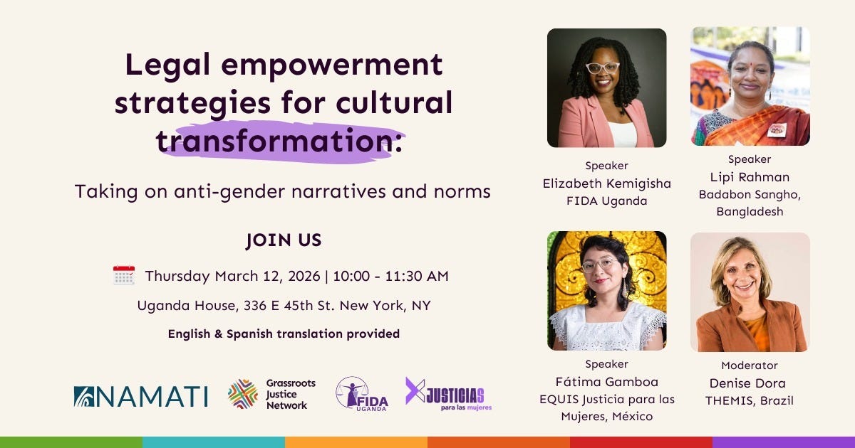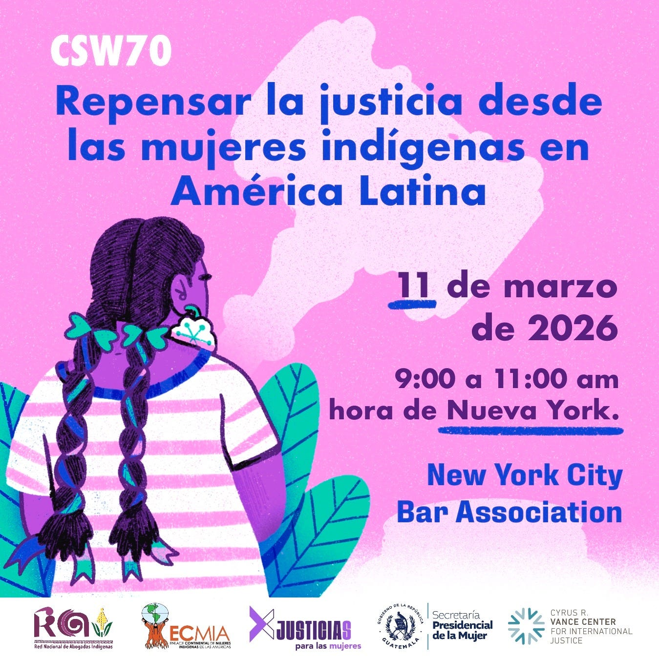 En el marco de la CSW, la RAI, EQUIS Justicia para las Mujeres, ECMIA, SEPREM y el Colegio de Abogados de Nueva York les invitamos a un espacio de diálogo sobre los desafíos que enfrentan mujeres y niñas indígenas para acceder a los sistemas de justicia y cómo repensar las justicias desde un enfoque intercultural, antirracista y con perspectiva de género.