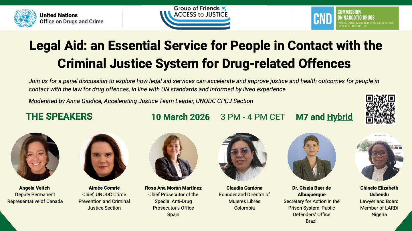 Join us for a panel discussion to explore how legal aid services can accelerate and improve justice and health outcomes for people in contact with the law for drug offences, in line with UN standards and informed by lived experience.