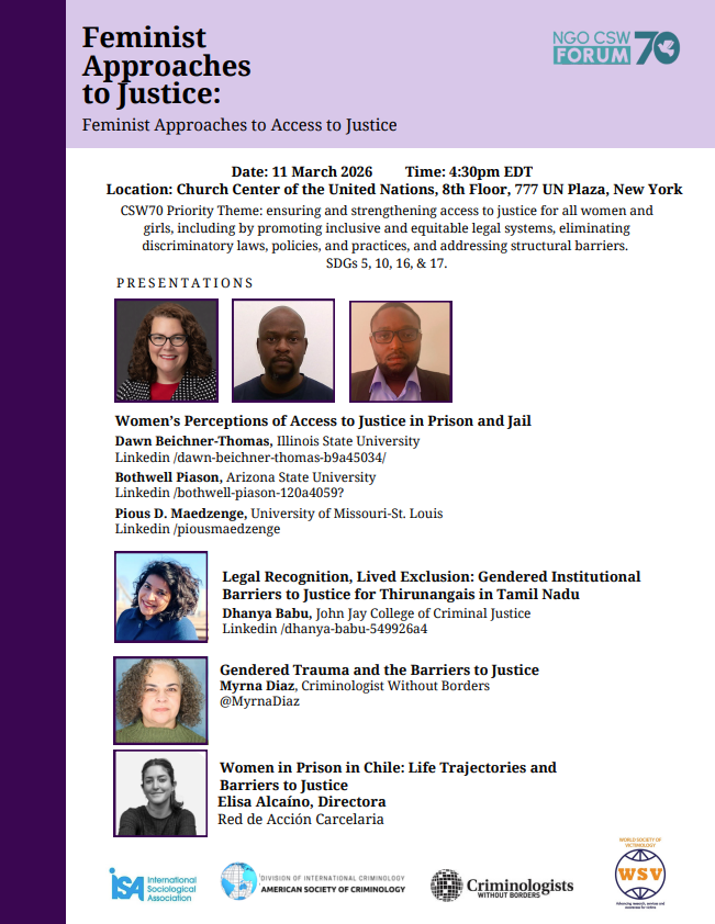 This panel will explore how gender inequality, discrimination, and violence shape women’s involvement with criminal legal systems across different regions. Speakers will examine discriminatory laws, gender-blind procedures, and systemic bias that contribute to the rising number of women in prison worldwide.