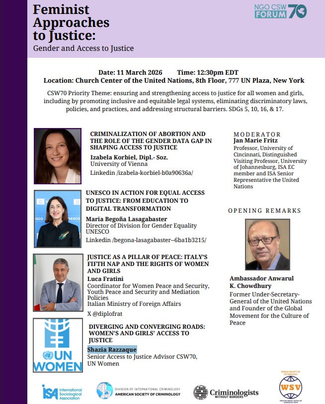 This guide is being sent by email on 26 February 2026, but will be updated regularly during CSW70, so please feel free to return and stay up to date on all that is going on. For those receiving this for the first time as an email subscriber, you will need to click on the ‘online’ version of this newsletter to see updates (you will find this also via our Women Beyond Walls Substack home page). We will also share updates on Women Beyond Wall’s social media channels.